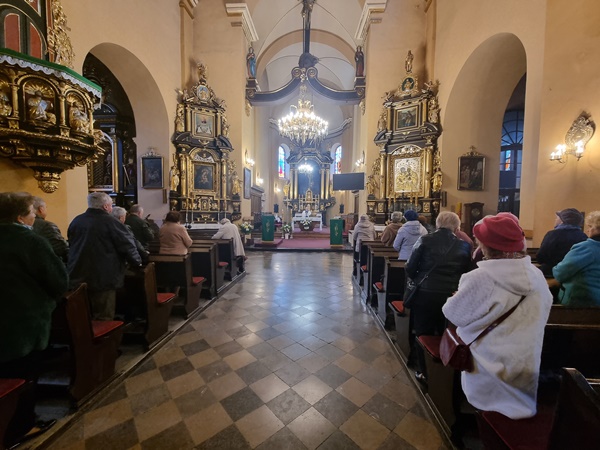 W nastrojowo oświetlonej Kaplicy Pojednania, przy akompaniamencie akordeonu, na którym przygrywał p. organista, popłynęły słowa i dźwięki tak bliskie sercu każdego Polaka. Ks. proboszcz, każdy utwór poprzedził krótką historią jego powstania. Były one tworzone od XV do początku XX wieku. Słowa układali nieznani, w większości, autorzy. Melodie tworzyli także anonimowi kompozytorzy, bo też czynili to, nie dla własnej sławy, ale na większą chwałę Boga. Nawiązują one do znanych nam tańców narodowych: dostojnego poloneza czy kujawiaka, ale także do marsza („Przybieżeli do Betlejem pasterze”). Dowiedzieliśmy się, na czym polega różnica między kolędą a pastorałką. Kolędy mają treść o wykładni teologicznej i zawierają dobrą nowinę o Narodzeniu Pańskim. Pastorałki, z kolei, zawierają opowieści pasterskie wykorzystywane w przedstawieniach, zwanych „jasełkami”. Wyśpiewano więc radośnie m.in.: „Z narodzenia Pana” i „Wesołą nowinę”, „Gdy się Chrystus rodzi” i „Anioł pasterzom mówił”, „Jezus malusieńki” i „Lulajże, Jezuniu” oraz, przybyłą do nas z niedalekiej Austrii, „Cichą noc”. Pani Róża wykonała a’capella współczesną „Kolędę dla nieobecnych”. Na koniec, wyśpiewano w rytmie staropolskiego poloneza kolędę pt. „Bóg się rodzi”. Ułożył ją w XVIII w. wybitny poeta polskiego oświecenia – Franciszek Karpiński, autor także innych śpiewanych w naszych kościołach pieśni: „Kiedy ranne wstają zorze” czy „Wszystkie nasze dzienne sprawy”.